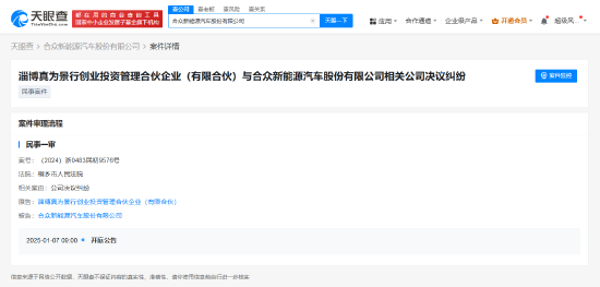 新浪科技讯 1月2日上昼音信,天眼查王法案件信息披露,近日,哪吒汽车有关公司合众新能源汽车股份有限公司新增一则开庭公告,原告为淄博真为景行创业投资措置结伙企业(有限结伙),案由为公司决策纠纷,该案将于1月7日在桐乡市东说念主民法院开庭审理。